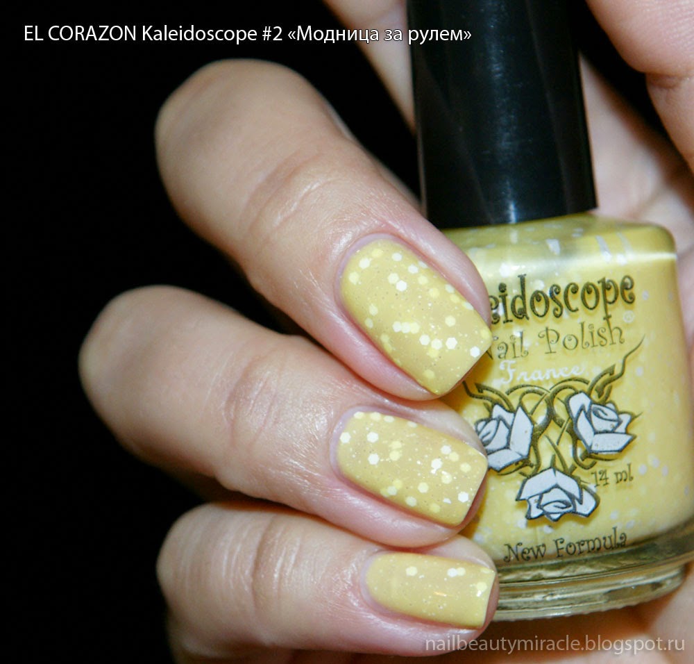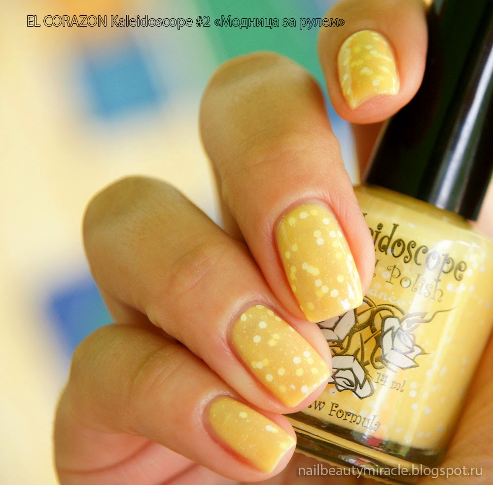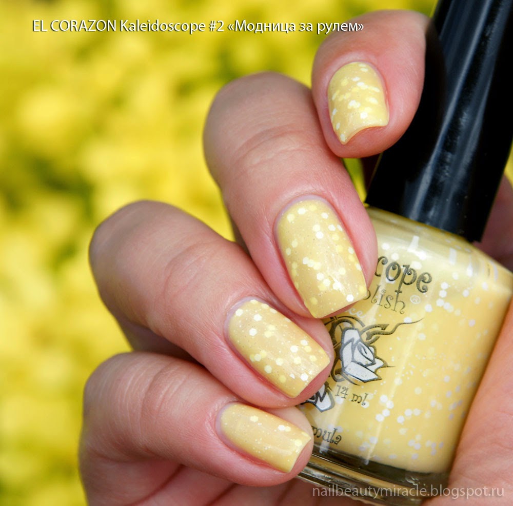 "Модница за рулем" - один из представителей лаков EL CORAZON из новой коллекции 2013 года Kaleidoscope "Модница". Изюминка лака - это желейная текстура с серебристым глиттером крупного и мелкого размеров, но в готовом маникюре он выглядит белым. Оттенок тоже необычный, приглушенный пастельно-желтый, очень нежный, практически нюдовый. Пигмент средний ближе к прозрачному. Консистенция лака на первый взгляд может показаться жидкой, но это не так, каждый слой ложиться достаточно густо и после высыхания почти не усаживается, поэтому, чтобы избежать эффекта слоеного пирога, вполне достаточно двух слоев. И, как показывает моя личная практика, во избежание мелких пузырьков - просушка каждого слоя лака не менее 5-7 минут. Стойкость меня опять-таки порадовала, 3-4 дня без затирания кончиков и потускнения, что для желейных лаков вполне удачно.