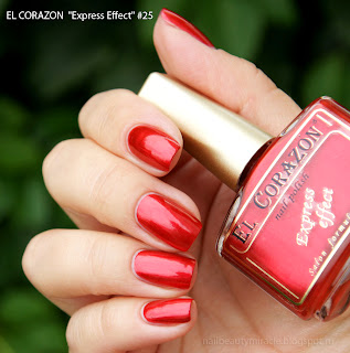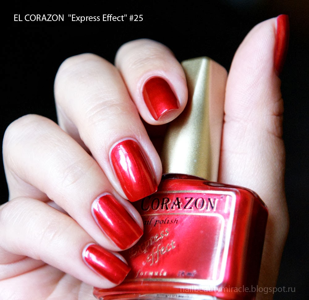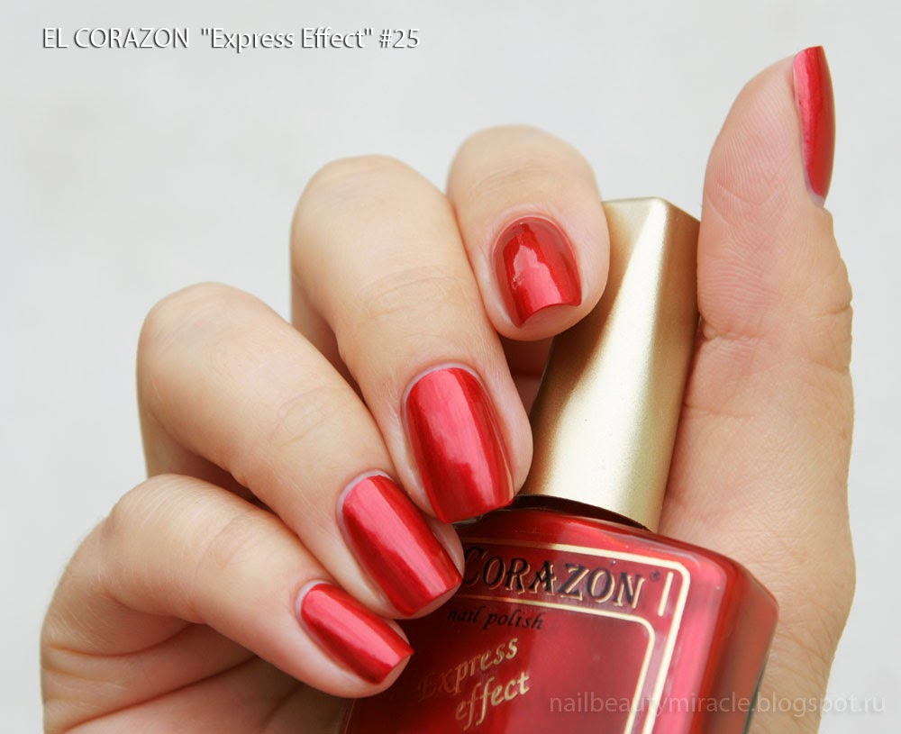 EL CORAZON "Express Effect" #25 - ярко-алый оттенок, металлическо-перламутровая текстура, при нанесении полосит, но слегка усаживается при высыхании.