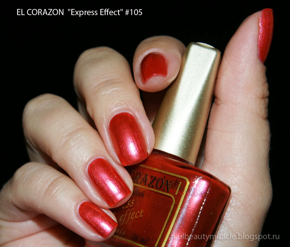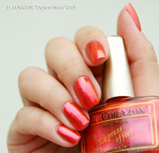 EL CORAZON "Express Effect" #105 - яркий кораллово-алый оттенок, перламутрово-металлическая текстура, слегка дуохромит оранжевым, пигмент средний и только в два-три слоя дает плотное и шасыщенное покрытие.
