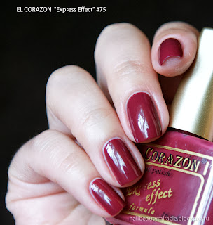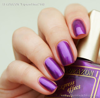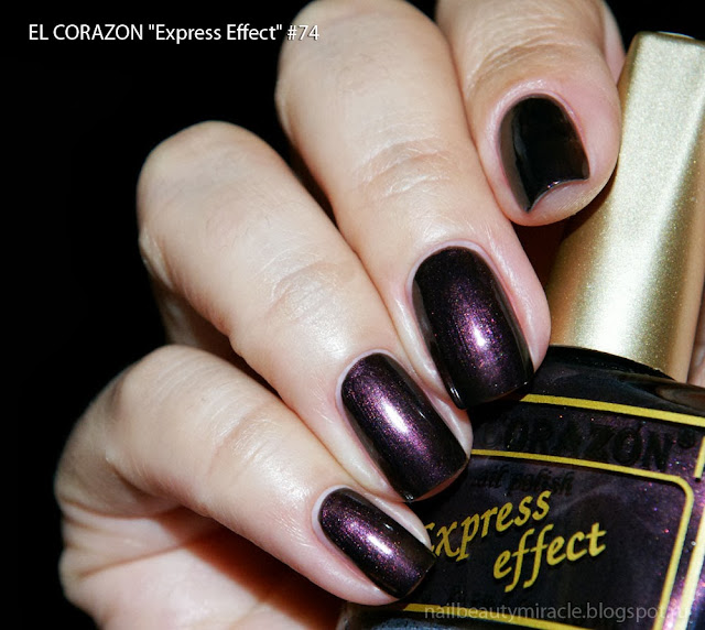 EL CORAZON "Express Effect" #74 - холодный темно-баклажановый на черной базе оттенок, мелкая шиммерная текстура, первый слой ложиться почти прозрачно, на втором пигмент уже заметный и явно выраженный.