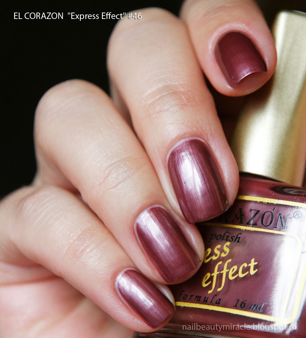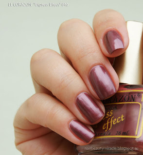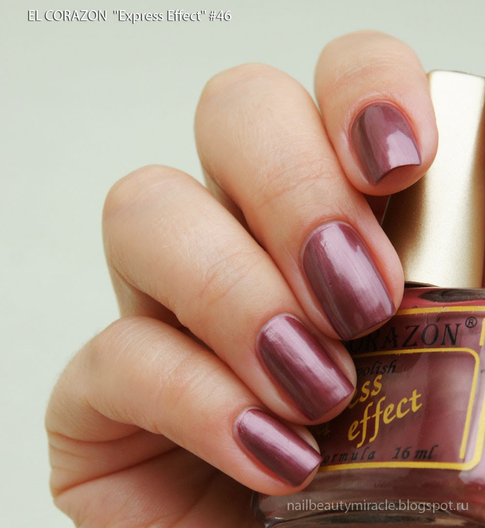 EL CORAZON "Express Effect" #46 - классический маув, текстура перламутровая, проблематичная в нанесении, даже после высыхания, полосы отчетливо заметны.