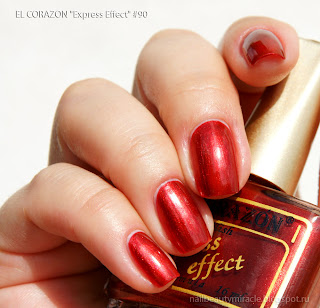 EL CORAZON "Express Effect" #90 - яркий огненно-красный оттенок, металлическо-перламутровая текстура, средний пигмент, требующий двух-трех слоев покрытия, легкая полосатость при нанесении и почти незаметная после высыхания.