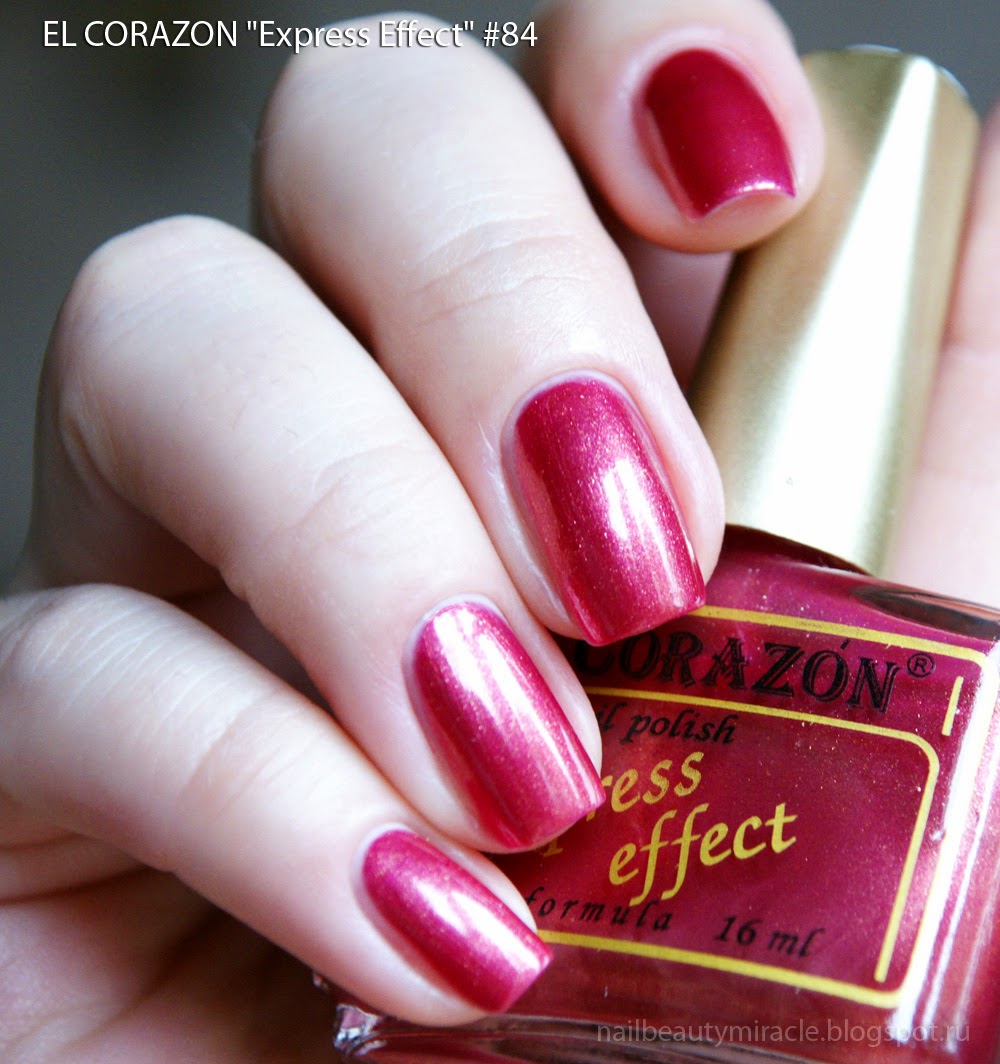 EL CORAZON "Express Effect" #84 - лак с крупной шиммерной текстурой, при этом шиммер явно-выраженный и отчетливо заметный золотистого цвета. Оттенок амарантовый, иногда светло-ягодный. Пигмент средний ближе к прозрачному, требуется не менее трех слоев.