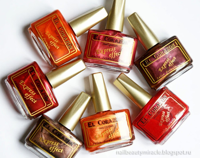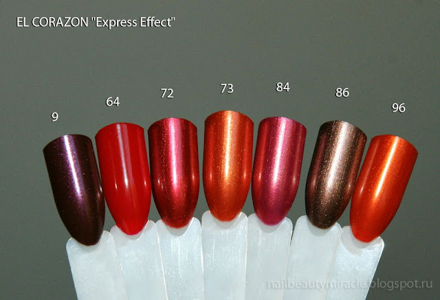 Завершающая часть лаков EL CORAZON серии "Express Effect". На этот раз оттенки все яркие, сочные, насыщенные, с плотным и средне-плотным пигментом. Но, при этом, все вполне классические и подходящие для любой ситуации.