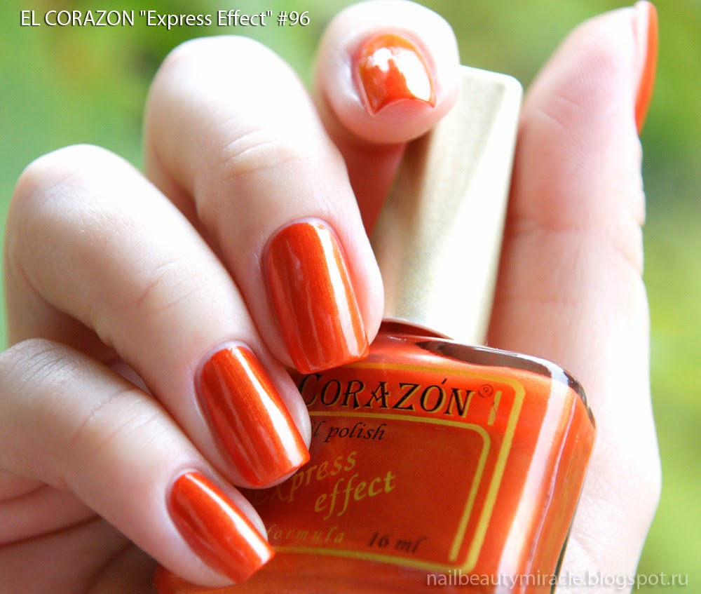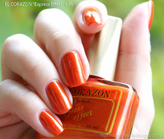 EL CORAZON "Express Effect" #96 - лак с перламутровой текстурой, но при этом очень усидчивый и абсолютно не проблемный в нанесении. Оттенок ярко-рыжий, огненный. Пигмент плотный.